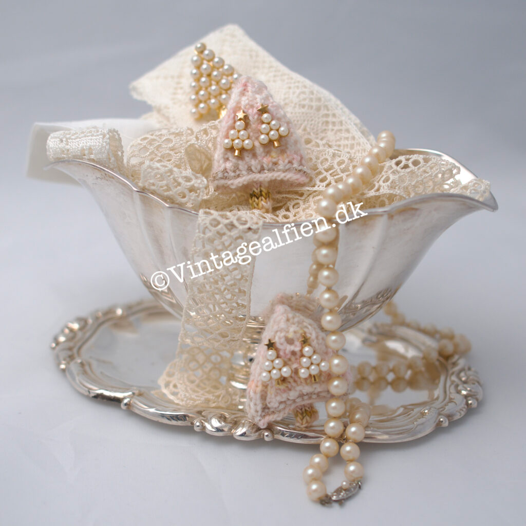 ← De strikkede juletræer pyntes med perler, knapper eller brocher