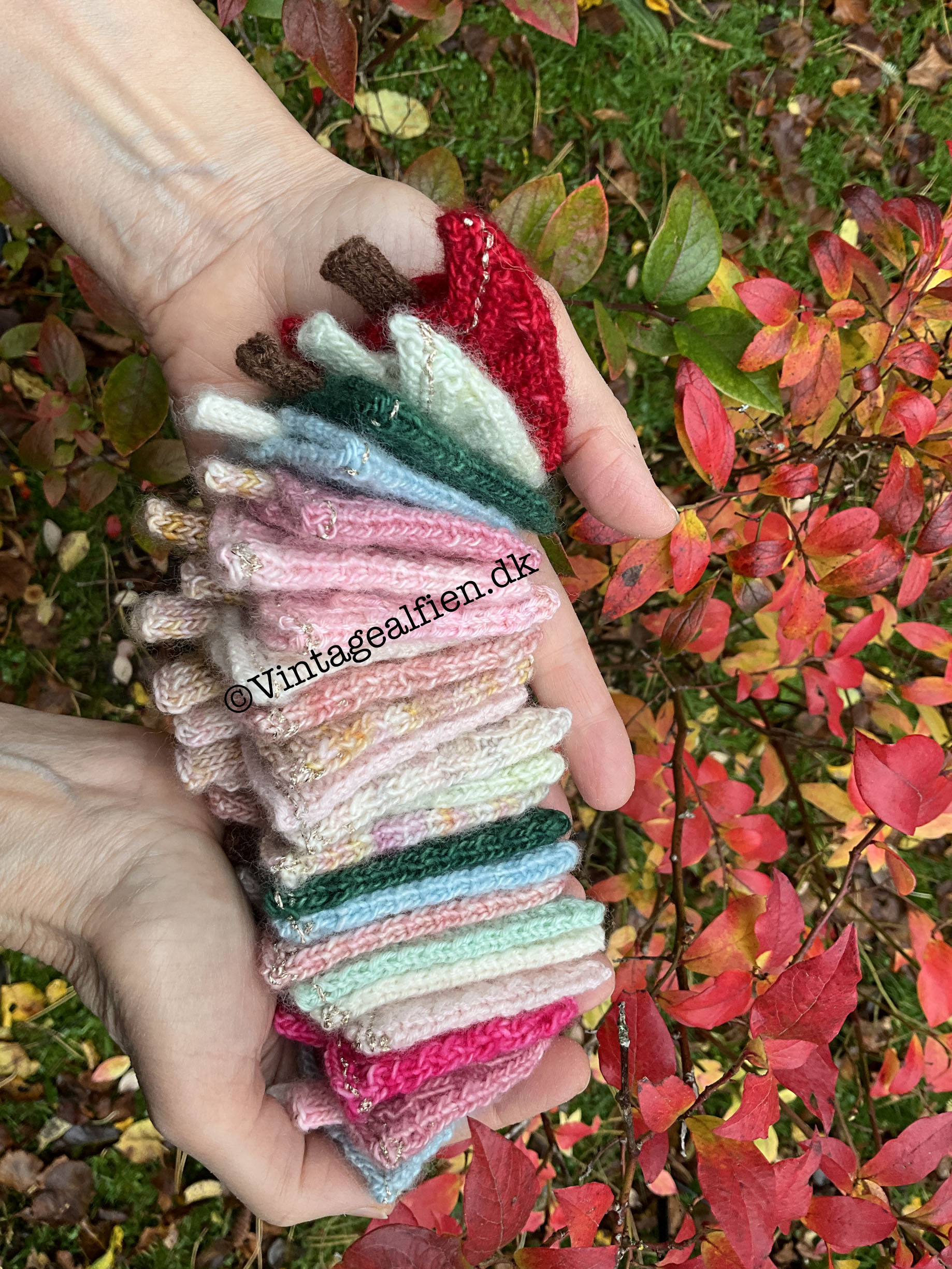 ← De strikkede juletræer pyntes med perler, knapper eller brocher